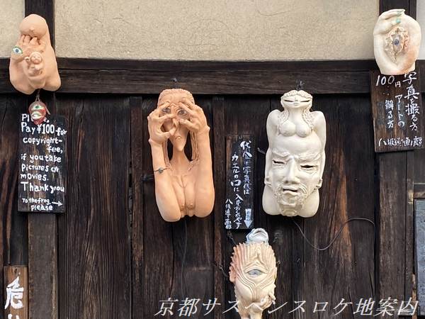 画面をよく見ると、後ろの塀に何やらボコボコしたものが映り込んでおります。これはお隣のギャラリーの塀に、かなり以前から掲げられた非常に個性的な作品群で、大変ひと目を引くのですが、「写真を撮る方100円」と書いてあるのが更に目を引きます。